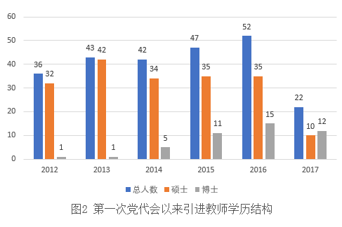 第一次党代会以来,学校的师资队伍规模进一步扩大,数量大幅增长。引进硕士以上教师233人,其中博士45人。到2017年8月,我校职工总数达到702人,其中博士106人(含在读)。新增高级职称教师103人,高级职称教师由原来的24.5%提高到39.7%,博士由原来的3.6%提高到12.3%。具有高级职称和博士学位教师的比例明显提高,师资队伍数量(表1)、学历学位(图2)以及学缘结构等(表2)都有较大改善,师资队伍结构得到明显优化。